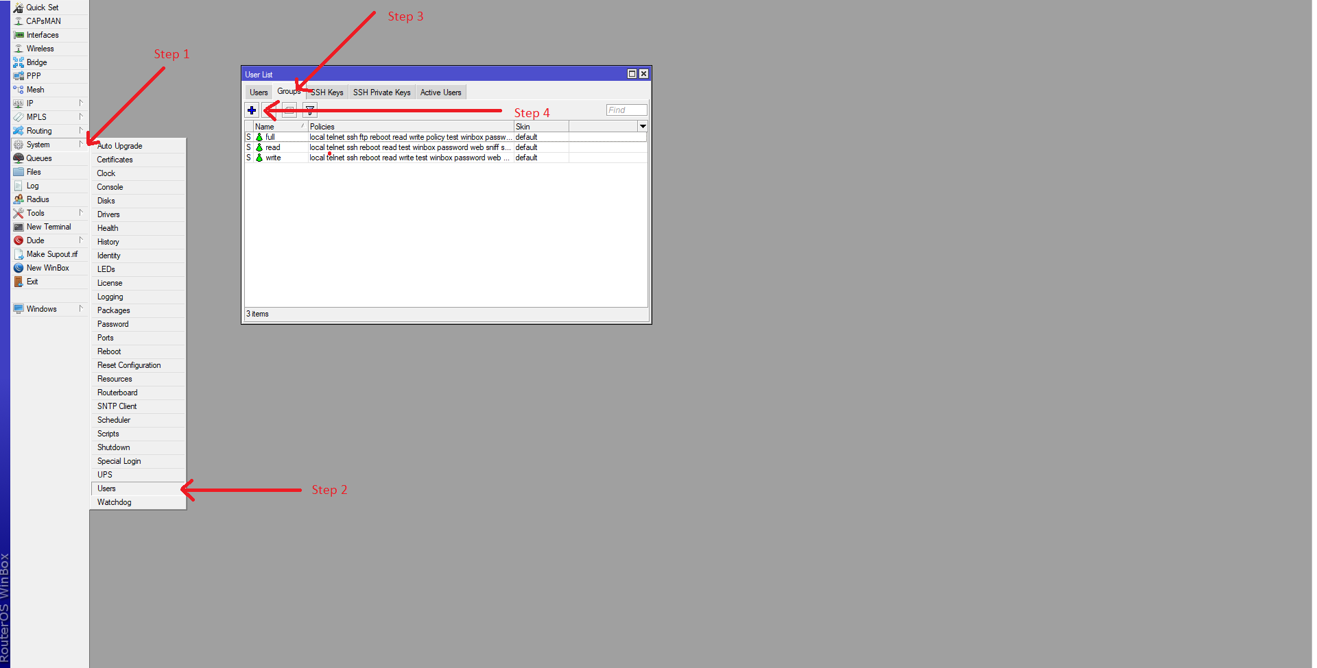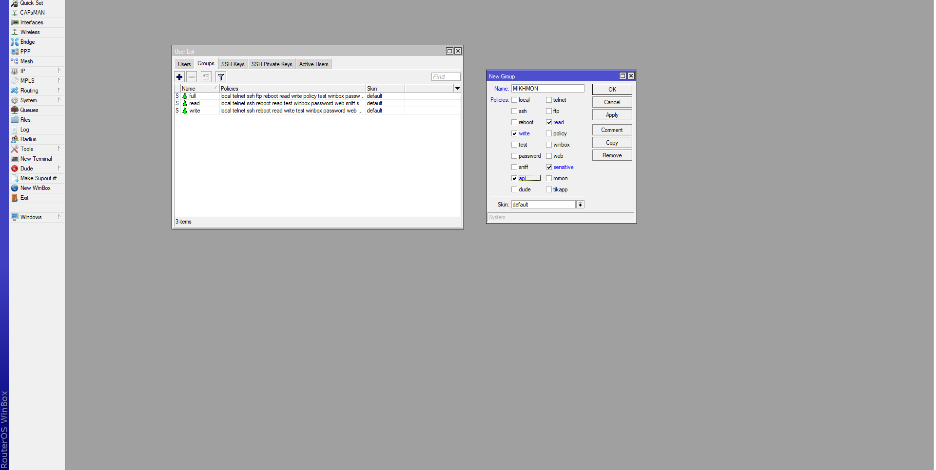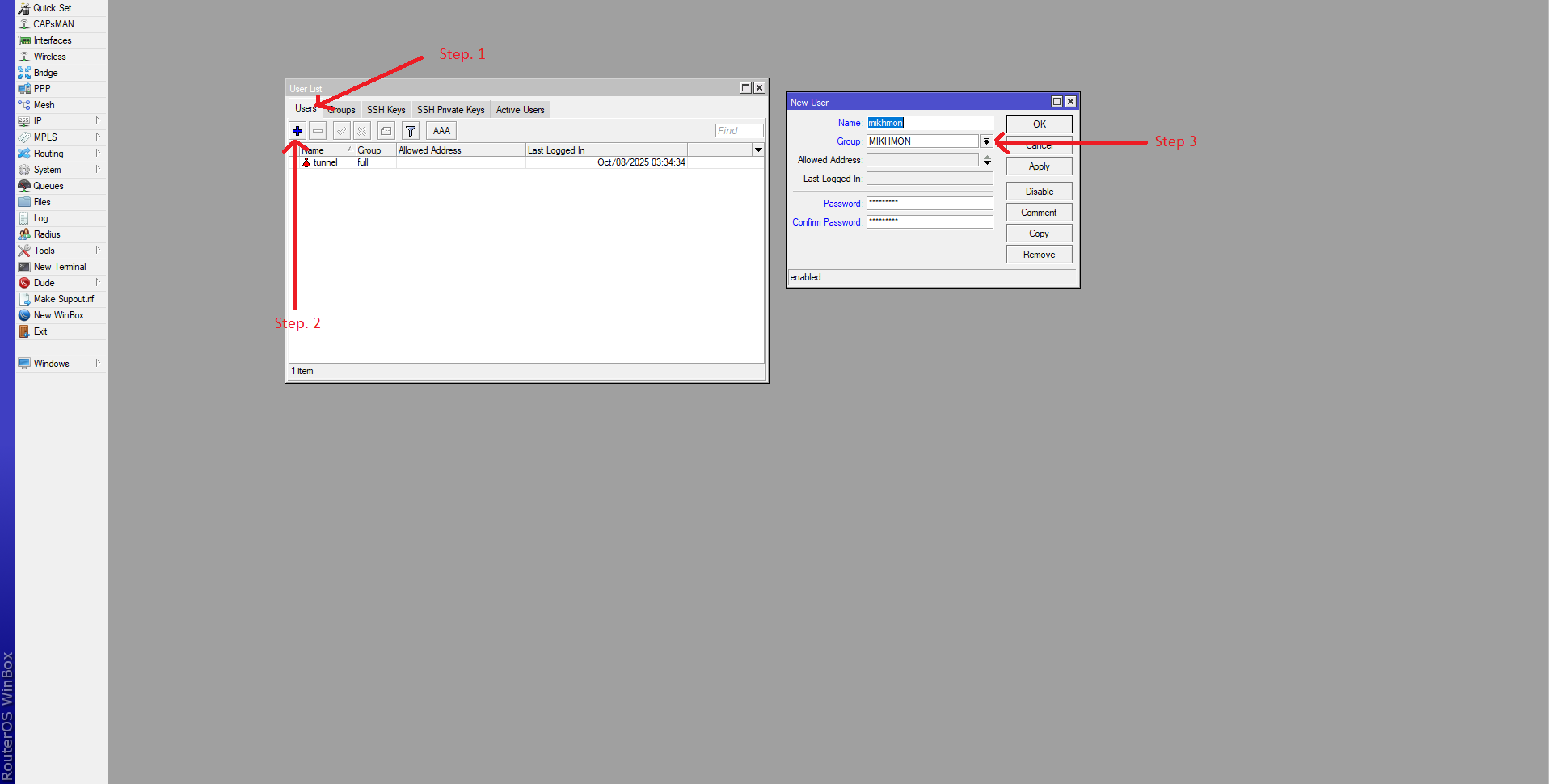 - Jika sudah membuat group MIKHMON masuk ke tab Users