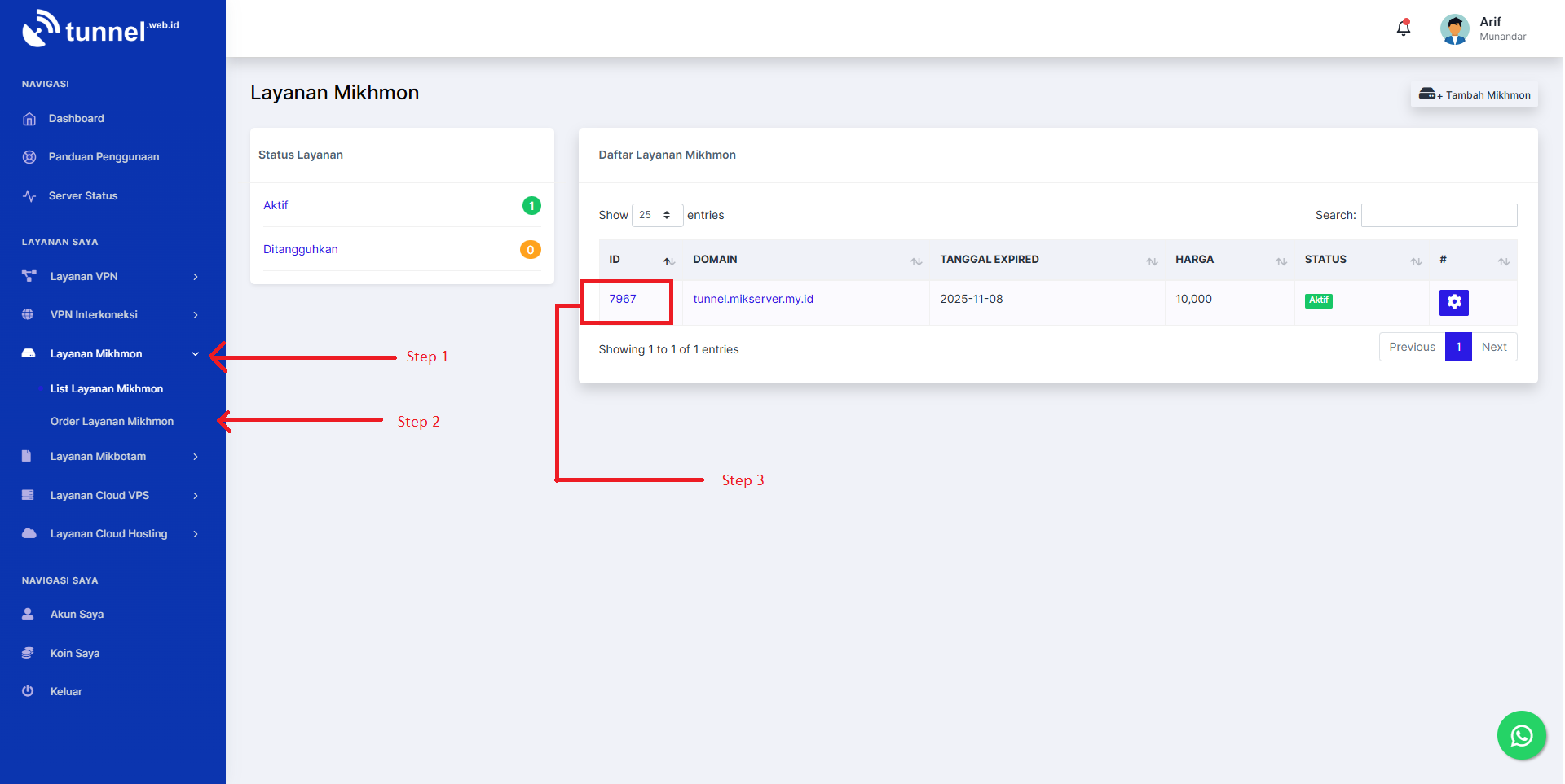 - Kemudian Klik ID Layanan Mikhmon yang akan diproses