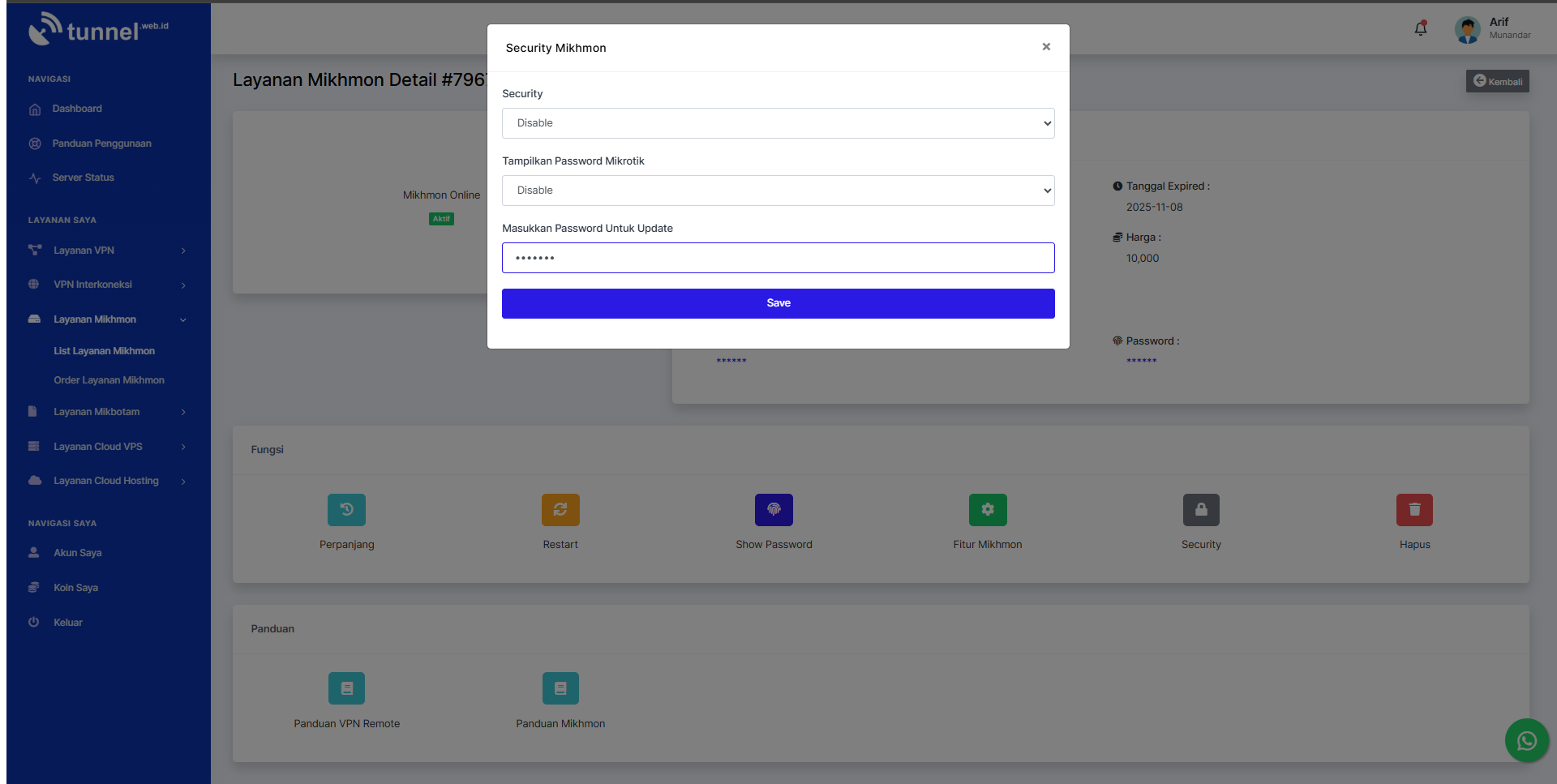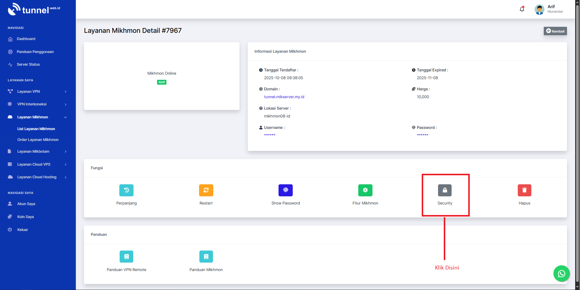 - Jika halaman sudah masuk ke halaman Layanan Mikhmon Detail, scroll dan cari tombol Security